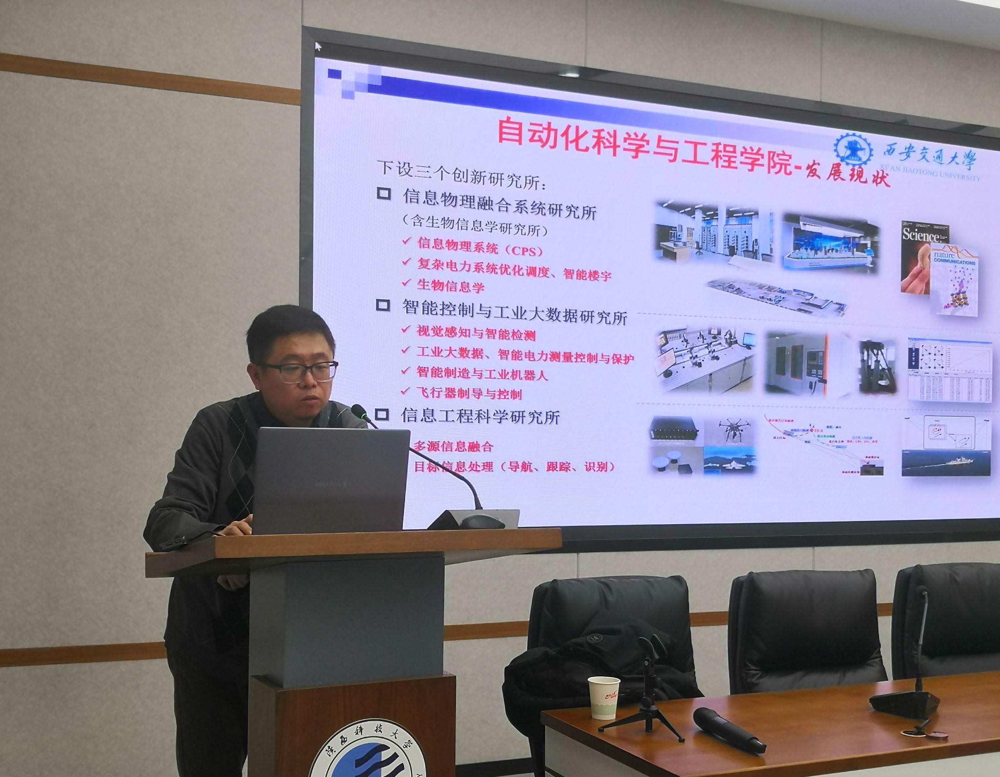 12月27日下午,電氣與控制工程學(xué)院邀請西安交通大學(xué)韓德強(qiáng)教授做客我校“前沿科學(xué)報(bào)告”。作了題為“基于多源信息互補(bǔ)融合的目標(biāo)信息處理”的學(xué)術(shù)報(bào)告。會(huì)議由電控學(xué)院副院長周強(qiáng)主持,相關(guān)專業(yè)教師和研究生參加了會(huì)議。