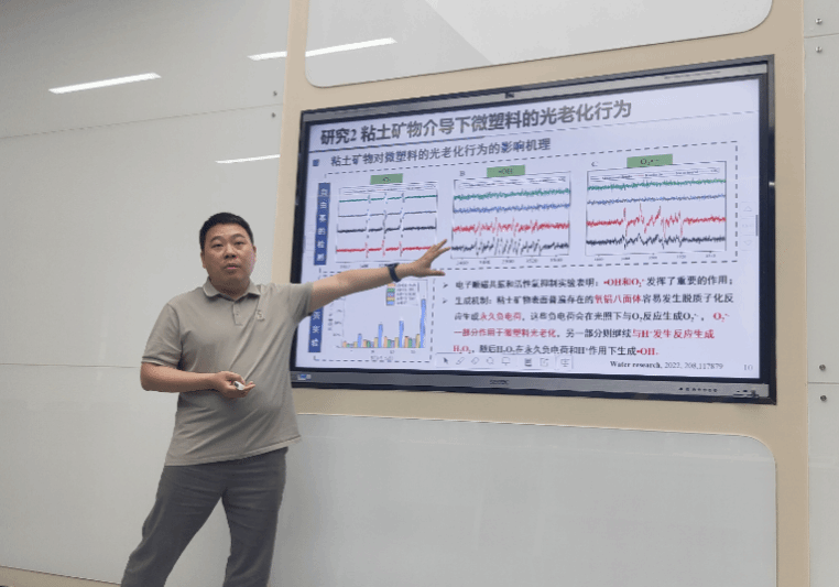 郭學(xué)濤教授介紹到土壤環(huán)境中微塑料的光老化機(jī)制尚不明確,并結(jié)合自己的研究介紹了微塑料在不同類型土壤中光老化的一系列成果,包括:通過對比光降解過程中微塑料的質(zhì)量損失、表面形貌和微觀結(jié)構(gòu)的變化發(fā)現(xiàn)光照可以誘導(dǎo)微塑料在土壤中發(fā)生老化,有機(jī)質(zhì)、粘土礦物和鐵(氫)氧化物是促進(jìn)微塑料在土壤中光老化過程的主要因素;在研究土壤礦物(粘土礦物和鐵(氫)氧化物)對微塑料老化的影響中發(fā)現(xiàn)自由基(?OH)在土壤礦物介導(dǎo)下微塑料的光降解過程中發(fā)揮了重要的作用;之后對陸源溶解性有機(jī)物的理化特性、分子組成和光化學(xué)性能進(jìn)行考察,發(fā)現(xiàn)陸源溶解性有機(jī)物的內(nèi)在屬性(類型、分子量)在微塑料老化中扮演著重要角色,明確了自由基生成、電子轉(zhuǎn)移與陸源溶解性有機(jī)物的內(nèi)在屬性之間的聯(lián)系。