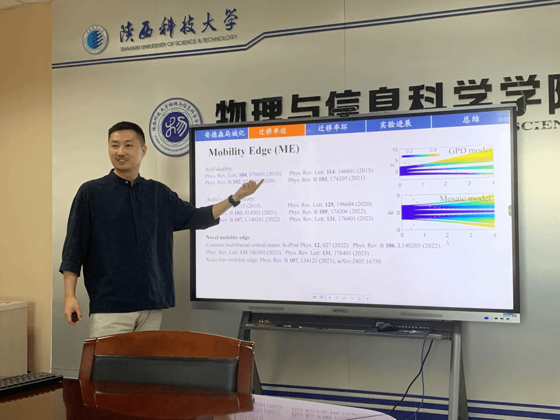 報告會上,李志副教授首先向與會師生介紹了安德森局域化的物理意義和內涵,從而引出了固體物理中遷移率邊的概念。接下來從理論上解釋了遷移率邊出現的原因以及實際物理系統(tǒng)中有關遷移率邊的實驗研究。李志副教授團隊在傳統(tǒng)厄密系統(tǒng)的遷移率邊概念的基礎上,考慮非厄密物理系統(tǒng)中遷移率邊的新特性,提出了遷移率環(huán)的概念。李志副教授團隊堅持理論與實驗相結合開展研究工作,他隨后向大家介紹了華南師范大學超冷原子物理團隊驗證理論結果所搭建的實驗平臺,以及目前的一些研究進展。