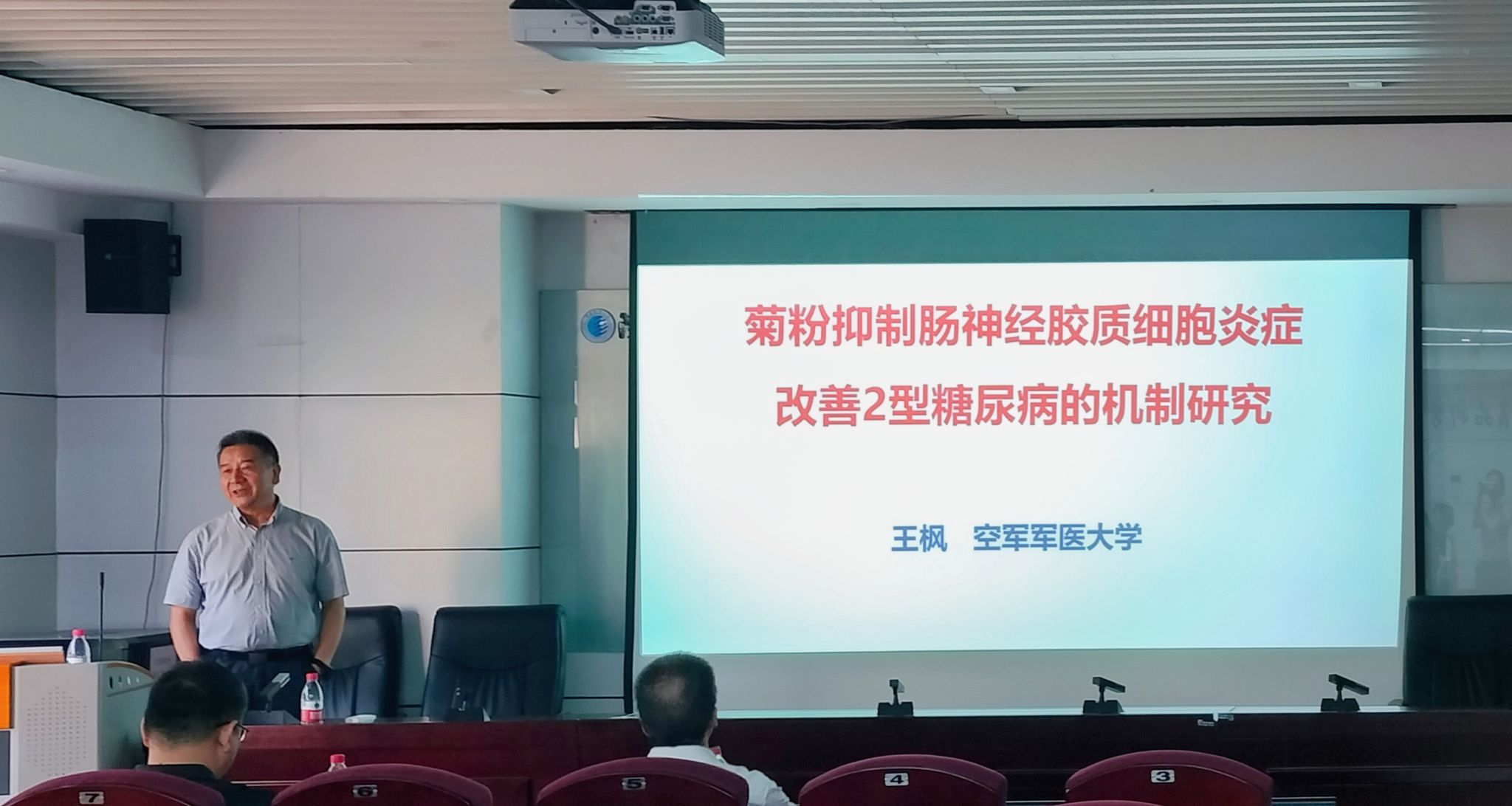6月25日上午,應(yīng)科技處和食品科學(xué)與工程學(xué)院(生物與醫(yī)藥學(xué)院)邀請(qǐng),空軍軍醫(yī)大學(xué)軍事預(yù)防醫(yī)學(xué)系營(yíng)養(yǎng)研究室王楓教授作了題為“菊粉抑制腸神經(jīng)膠質(zhì)細(xì)胞炎癥改善2型糖尿病機(jī)制研究”的學(xué)術(shù)報(bào)告。食品學(xué)院部分教師和研究生代表參加本次報(bào)告會(huì),報(bào)告會(huì)由食品學(xué)院謝建武教授主持。