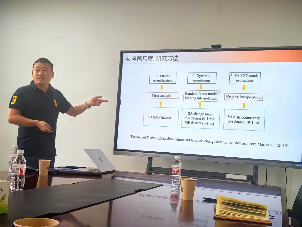互花米草是一種原產(chǎn)于北美大西洋沿岸的草本植物,近年來已迅速入侵中國海岸線,其中93%的入侵區(qū)域為泥灘地。盡管互花米草入侵通常被認(rèn)為會對濱海濕地造成負(fù)面影響,但其對土壤有機(jī)碳儲量的影響尚不明朗。王法明研究員介紹了互花米草入侵對中國沿海泥灘地土壤有機(jī)碳儲量的影響,揭示了互花米草入侵顯著提高了土壤有機(jī)碳儲量,且這種促進(jìn)作用在不同入侵時間、土壤深度和區(qū)域都普遍存在。王法明的研究為互花米草入侵對生態(tài)系統(tǒng)服務(wù)的影響提供了新的認(rèn)識,并強(qiáng)調(diào)了其作為一種潛在的自然解決方案,在助力中國海岸帶藍(lán)碳增匯方面的重要作用。未來研究需進(jìn)一步關(guān)注互花米草入侵對其他生態(tài)系統(tǒng)服務(wù)的影響,以及如何在實現(xiàn)碳中和目標(biāo)的同時,維持沿海生態(tài)系統(tǒng)的健康和可持續(xù)發(fā)展。