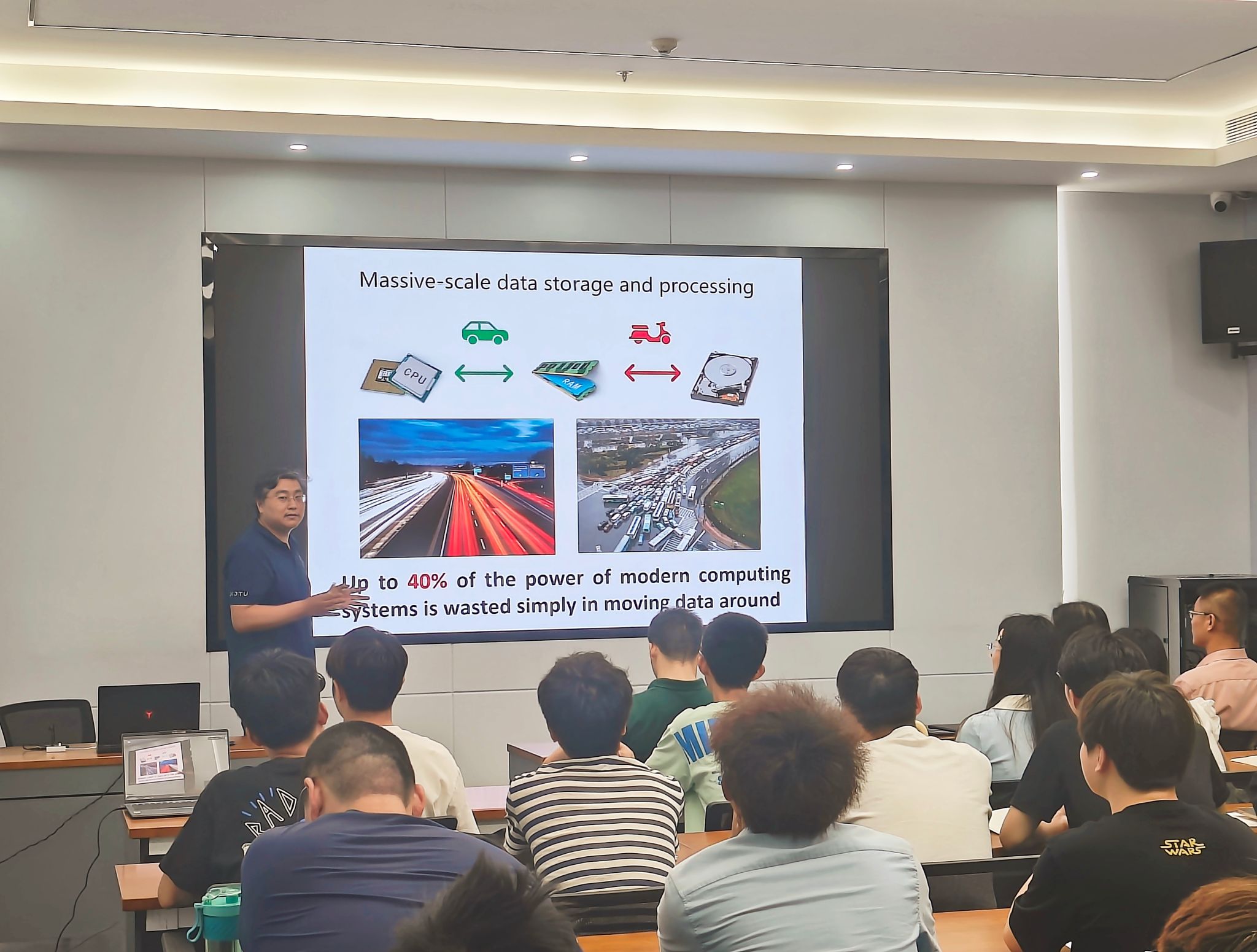張偉教授長期從事相變與非晶材料方面的研究,在相變存儲器與類腦計算的材料機理與制備工藝方面取得重要進展。在此次報告中,張偉教授首先從相變存儲材料的材料學基礎(chǔ)出發(fā),詳細介紹了相變材料的結(jié)晶化與非晶化機理,提出其在數(shù)據(jù)存儲、通用存儲器、神經(jīng)元計算以及人工智能硬件發(fā)展方面的核心作用,并從材料設(shè)計的角度指出了相變存儲芯片工業(yè)化過程中尚需解決的關(guān)鍵問題。此外,張偉教授針對青年學者在高水平論文寫作方面的問題與困惑,以自身寫作經(jīng)驗分享了寫作特點和寫作范式,并結(jié)合具體示例論文闡述了寫作的思路、存在問題和解決方法。最后在現(xiàn)場提問和交流環(huán)節(jié)中張偉教授為學院從事科學研究的學生答疑解惑并提出了許多中肯的建議。