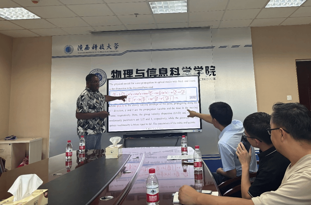 會議結(jié)束后,參會師生與 Emmanuel Kengne 教授就光學介質(zhì)中混合局域波與三階和四階色散的相互作用及其相關(guān)內(nèi)容開展了交流討論。此次研討會內(nèi)容全面,營造了良好的學術(shù)交流與討論氛圍,開闊了我校師生的科學視野,參會師生受益匪淺。