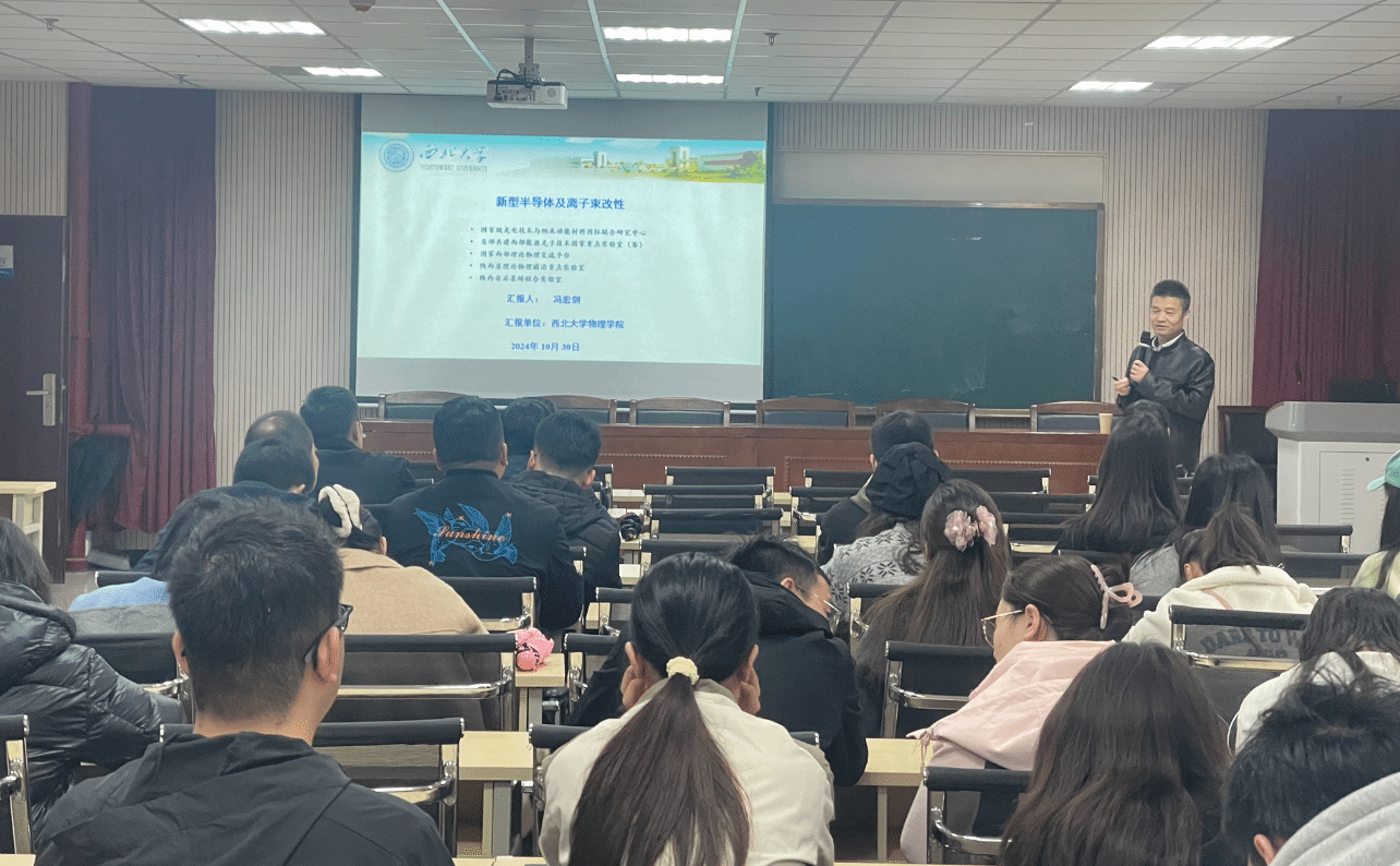 10月30日下午,應(yīng)我校物理與信息科學(xué)學(xué)院、科技處及前沿院邀請(qǐng),西北大學(xué)馮宏劍教授做客我?!扒把乜茖W(xué)報(bào)告”,作了題為“載能離子束改性鈣鈦礦器件及與物質(zhì)相互作用”的學(xué)術(shù)報(bào)告。報(bào)告會(huì)由物理學(xué)院院長(zhǎng)劉建科主持,學(xué)院相關(guān)專業(yè)師生近百人參加了此次報(bào)告會(huì)。