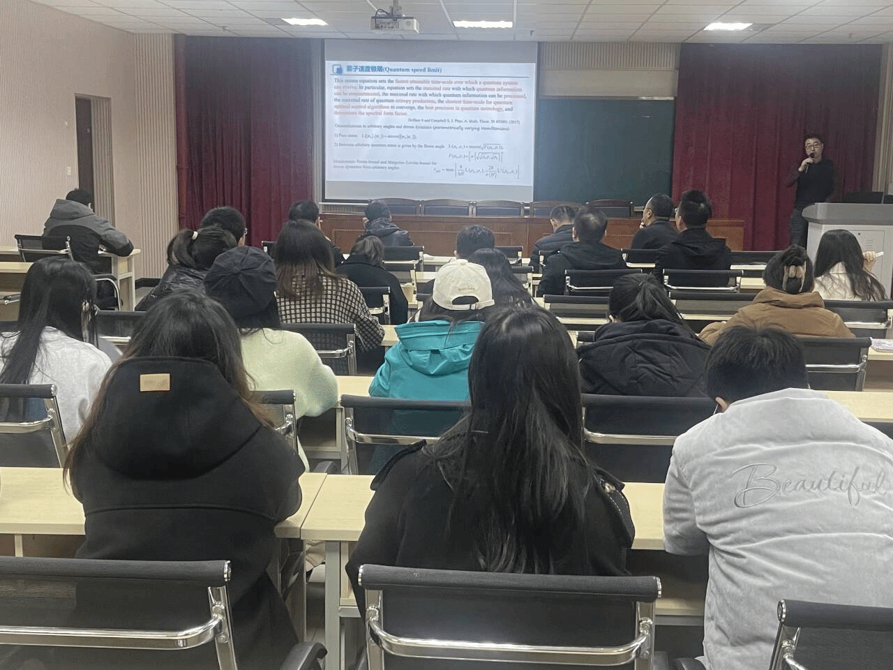 豆福全教授作了題為 “最速降線演化下量子速度極限”的學(xué)術(shù)報(bào)告。報(bào)告闡述了量子速度極限的概念及其物理背景,同時(shí)強(qiáng)調(diào)了這一問(wèn)題在眾多前沿科技領(lǐng)域所展現(xiàn)出的重要應(yīng)用價(jià)值。鑒于實(shí)際量子問(wèn)題的多樣性和復(fù)雜性,統(tǒng)一量子速度極限時(shí)間界限無(wú)疑是當(dāng)前研究領(lǐng)域中一項(xiàng)既具挑戰(zhàn)性又極具意義的課題。在報(bào)告中,豆教授還分享了課題組在這一領(lǐng)域取得的最新進(jìn)展:提出了一種創(chuàng)新的基于黎曼度規(guī)的量子最速降線幾何方法,獲得了任意量子系統(tǒng)的量子速度極限估計(jì)式,成功地將該理論推廣至更為復(fù)雜的開(kāi)放量子系統(tǒng)。與會(huì)師生與豆教授就量子速度及復(fù)雜量子系統(tǒng)特性等話題展開(kāi)了熱烈討論,會(huì)場(chǎng)學(xué)術(shù)氛圍濃厚。