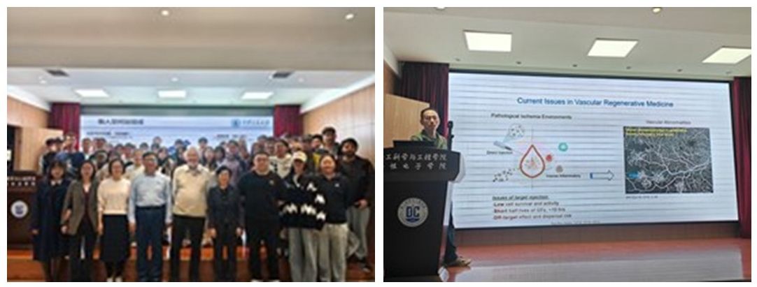 魏釗研究員從心血管疾病出發(fā),講述了目前傳統(tǒng)治療方案中存在的缺陷,介紹了水凝膠材料應用于醫(yī)學領(lǐng)域的優(yōu)勢,講解了水凝膠材料促進新血管生成的原理及其后續(xù)的性能調(diào)控,并對其中的力學機制進行了詳細的解釋,展望了水凝膠材料在再生醫(yī)學領(lǐng)域的發(fā)展?jié)摿?。這是我校國家重點研發(fā)計劃重點專項項目(2022YFE0104204200)第4次在我校開展國際學術(shù)交流活動。