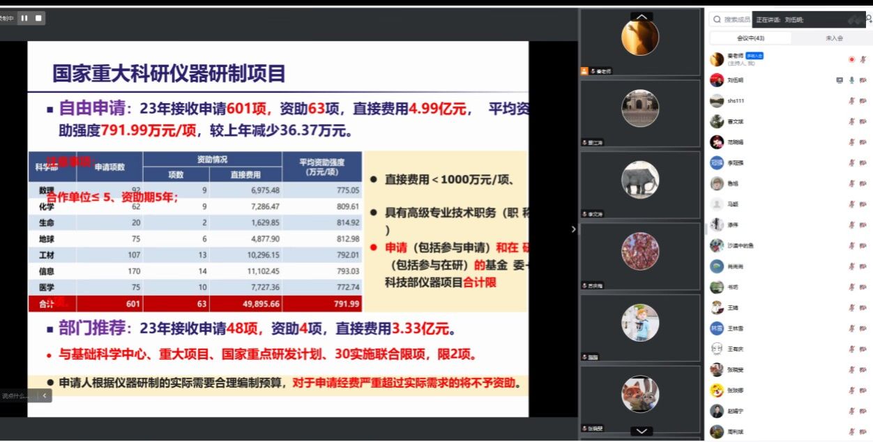 隨后,劉伍明研究員介紹了2025年國(guó)家自然科學(xué)基金項(xiàng)目資助體系、評(píng)審政策及申報(bào)書(shū)內(nèi)容撰寫(xiě)的注意事項(xiàng)。針對(duì)如何精準(zhǔn)凝練研究目標(biāo)、科學(xué)問(wèn)題,如何合理設(shè)計(jì)研究方案和技術(shù)路線,如何清晰展示預(yù)期成果和對(duì)社會(huì)的潛在貢獻(xiàn)做了詳細(xì)簡(jiǎn)介。并就教師申報(bào)過(guò)程中關(guān)注的問(wèn)題做了充分交流。
