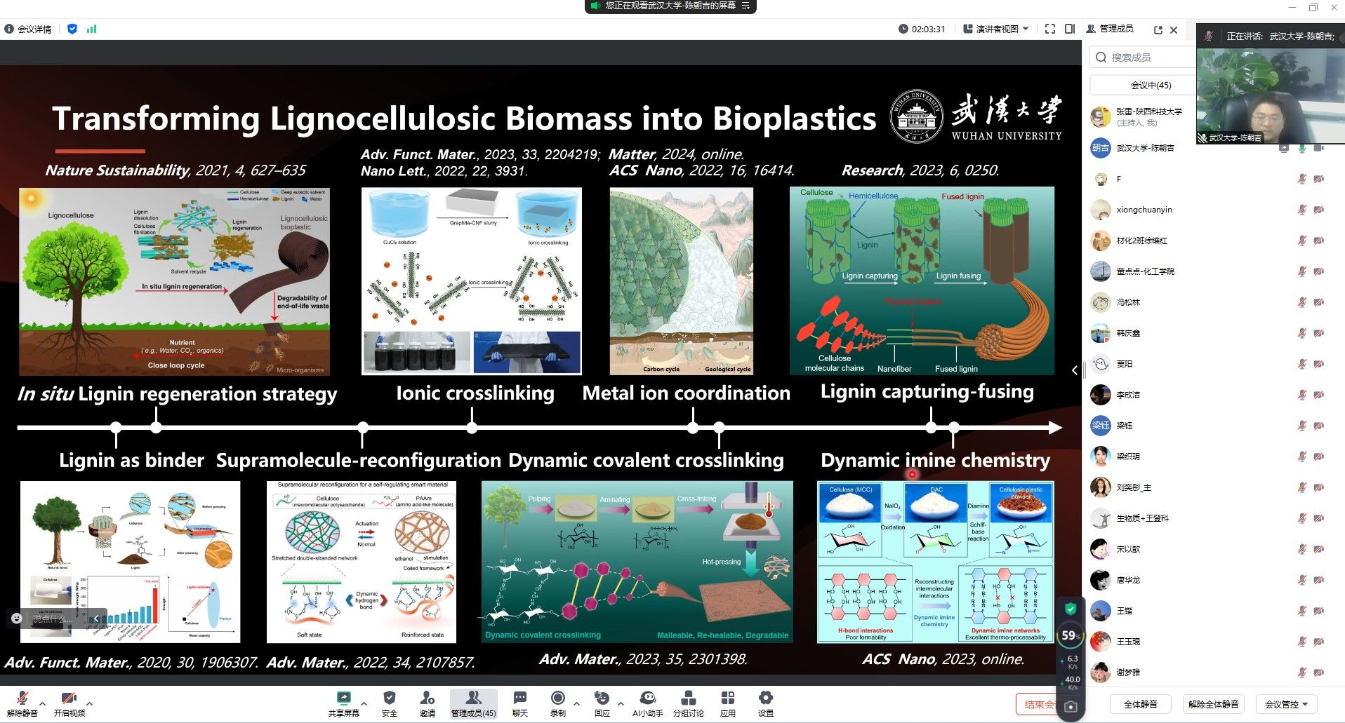 會(huì)上,陳朝吉教授就自己課題組利用木材具有的獨(dú)特分級(jí)多孔結(jié)構(gòu)和富含功能基團(tuán)的特性,對(duì)木質(zhì)生物質(zhì)結(jié)構(gòu)及組分進(jìn)行調(diào)控,從而提高木質(zhì)生物質(zhì)的性能,賦予其新功能。報(bào)告還探討了木質(zhì)生物質(zhì)材料的多尺度結(jié)構(gòu)設(shè)計(jì)策略及可持續(xù)功能化利用路徑,著重探討了古老的木質(zhì)生物質(zhì)如何“蛻變”為高科技材料及其如何應(yīng)對(duì)人類社會(huì)可持續(xù)發(fā)展及“碳中和”實(shí)現(xiàn)過程中面臨的材料-能源-環(huán)境挑戰(zhàn)。