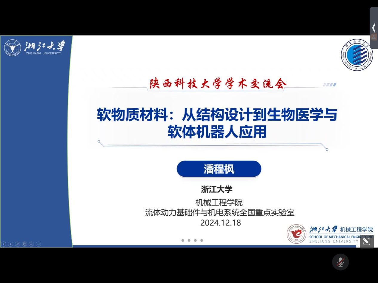 12月18日下午,應輕工科學與工程學院(柔性電子學院)、科技處和前沿院邀請,浙江大學潘程楓研究員做客我?!扒把乜茖W報告”,作了題為 “軟物質(zhì)材料:從結構設計到生物醫(yī)學與軟體機器人應用”的線上學術報告。輕工學院相關師生參加了本次報告會。