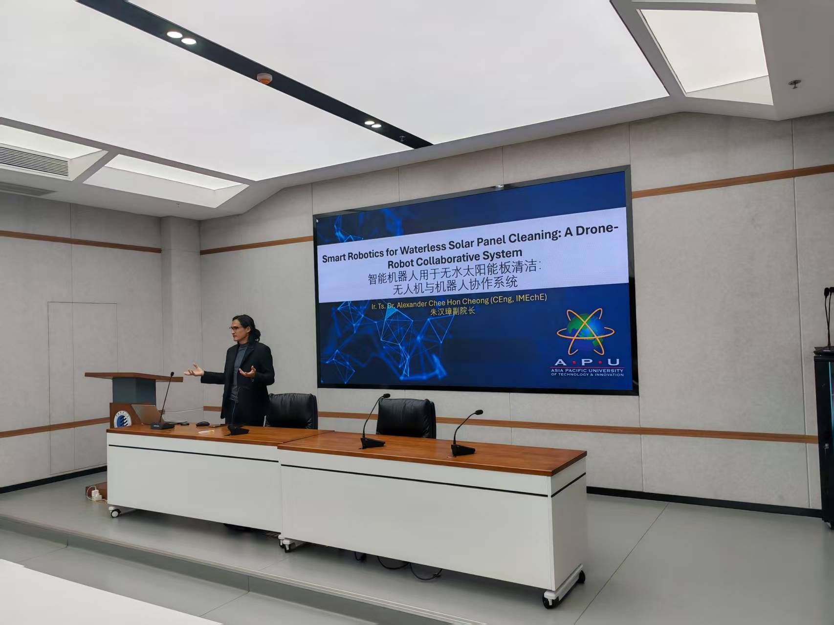 6月19日,應我校國際合作與交流處、機電工程學院(智能制造與機器人工程學院)邀請,馬來西亞亞太科技大學(APU)工程學院副院長Alexander Chee Hon Cheong教授來陜西科技大學訪問交流,并做題為“Smart Robotics for Waterless Solar Panel Cleaning: A Drone-Robot Collaborative System”的學術報告。機電工程學院副院長袁越錦教授、機器人教研室教師和研究生參加了本次報告會。